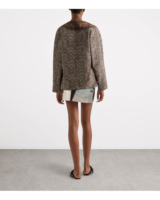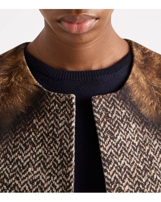 This Prada Caban jacket make look as though its embellished with a fur colour and a chevron design, but a closer inspection will unveil a falsehood. Smooth to the touch, it offers a unique play on texture that'll keep every fashion fan guessing.