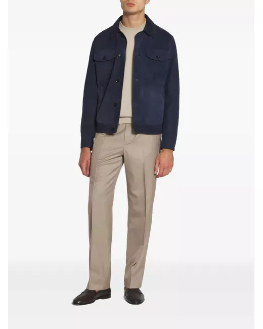 navy blue front button fastening two button-fastening chest pockets two side slit pockets buttoned cuffs