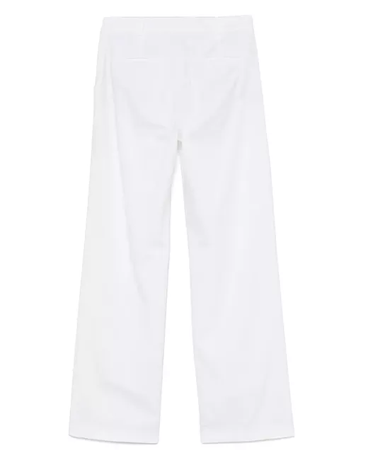 white concealed front button, hook and zip fastening belt loops two side slash pockets two rear welt pockets