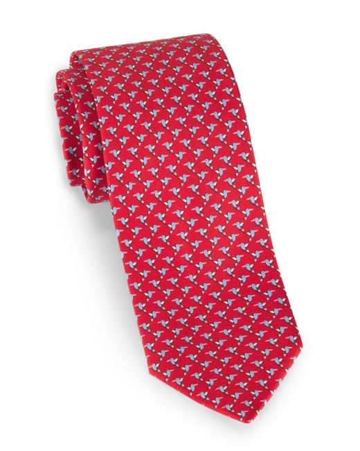 Ferragamo's Ziguli tie is crafted of silk and showcases a geometric-style bird print. 100% silk Dry clean Made in Italy SIZE Width: about 3.14" ABOUT THE BRAND Italian designer Salvatore Ferragamo began his journey in 1927 with a vision of creating the world's most beautiful shoes. The label expanded to menswear in the 1970s, and remains famed for its made-in-Italy pieces. The craftsmanship inherent in its shoes is also found in accessories like sunglasses, belts and ties. The brand's signature Gancini logo-a backwards horseshoe-can be found on its classic loafers and fine leather goods. Men Luxury Coll - Designer Neckwear > Ferragamo > Saks Fifth Avenue > Barneys. FERRAGAMO. Color: Rosso.