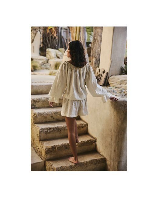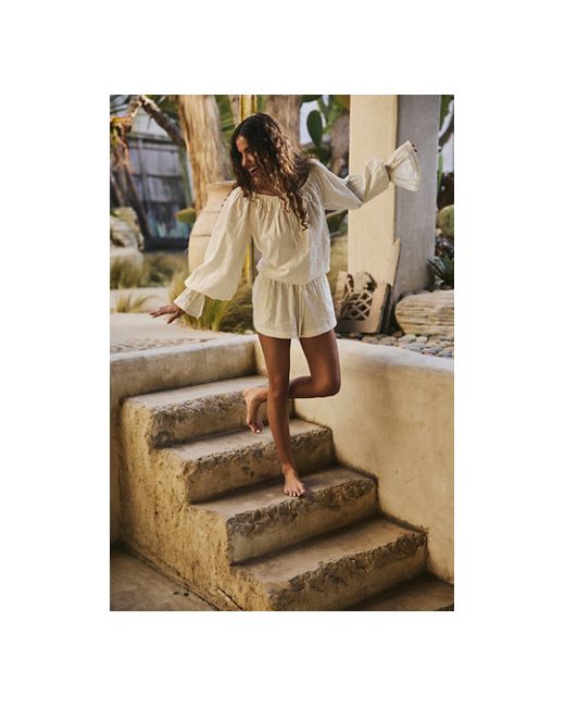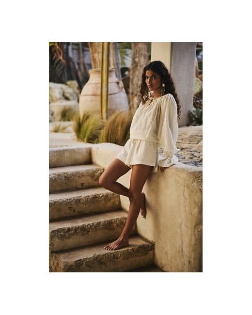 For effortless moments, slip into this seersucker romper from free-est, featuring a wide boat neckline with puffed long sleeves and a blousey bodice. **Fit:** Relaxed, step-in style **Features:** Seersucker fabrication, wide boat neckline with tie detail, balloon sleeves, flared cuffs, relaxed shorts, adjustable drawcord waistline **Why We ❤ It:** A necessity on your packing list, perfect for endless occasions from beachfront to sunset dinner. Estrella Romper by free-est at Free People in Coconut Milk, Size: XS
