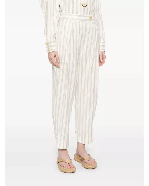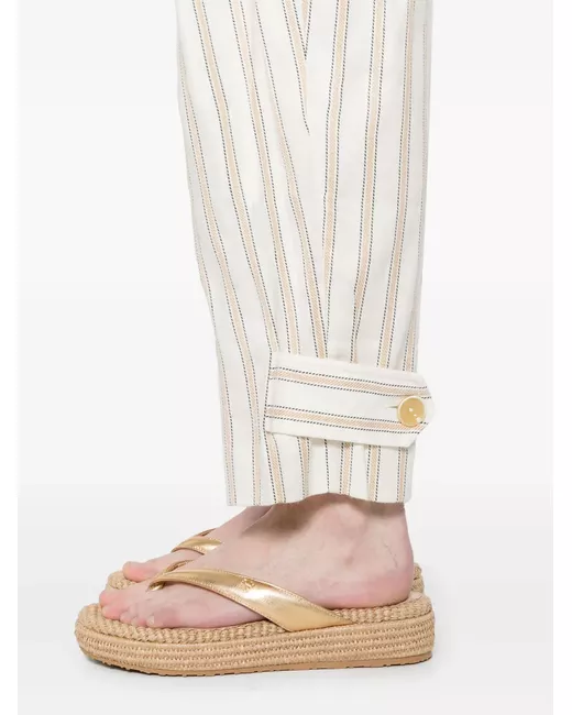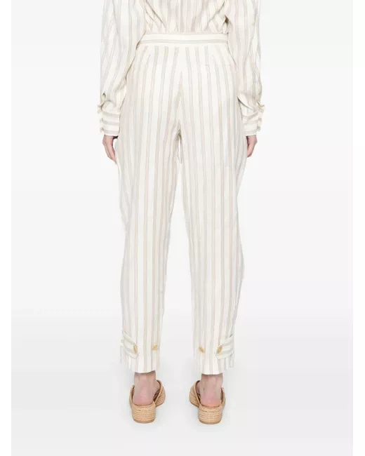 light beige front button and zip fastening two side slash pockets two rear welt pockets vertical stripe pattern