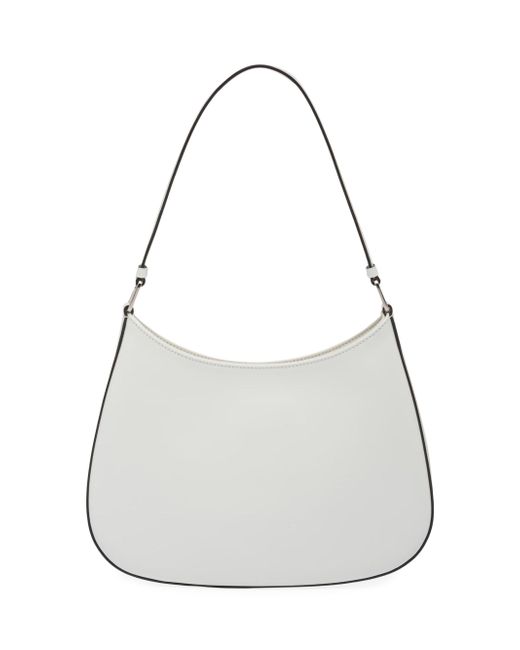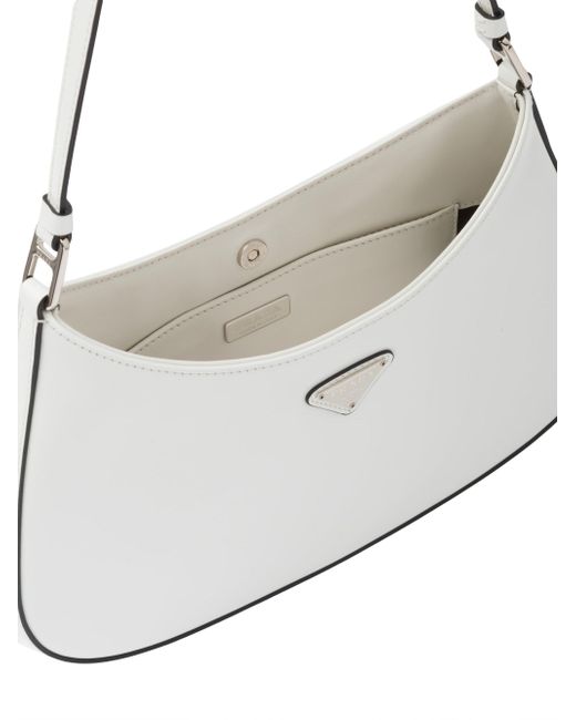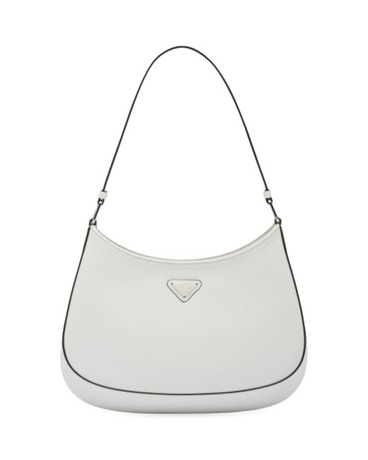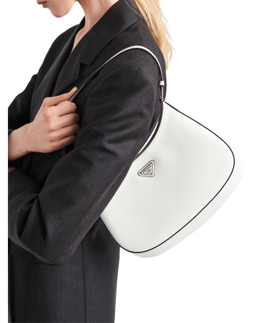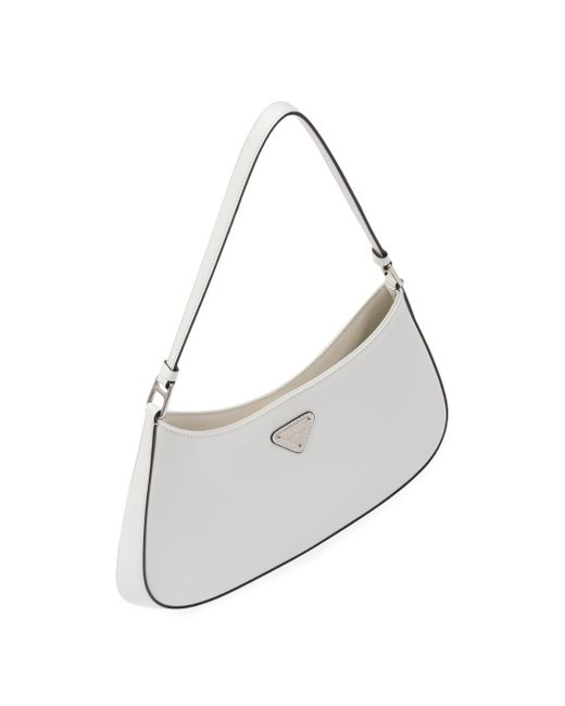 The Prada Cleo bag with sophisticated allure reinterprets an iconic design of the brand from the 1990's. Sleek curved lines emphasized by the particular construction rounded on the bottom and sides give this hobo bag a soft, light look. Brushed leather, a modern and versatile material that is distinctive in Prada collections, is ideal for creating always new combinations and contrasts. The enamel triangle logo decorates the silhouette. Brushed leather Leather handle Metal hardware Logo on enameled metal triangle at the front Magnet closure Prada logo nylon lining with patch pocket Imported SIZE 10.6'' W x 8.6'' H x 2'' L. Lsd Handbags - Prada Handbags Access > Prada > Saks Fifth Avenue > Barneys. Prada. Color: White.