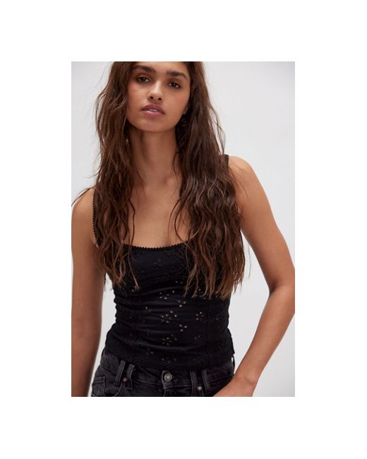 Sure to be your new go-to, this cami from Intimatey is featured in a stretchy, cotton eyelet for a touch of femme charm. **Fit:** Form-fitting, semi-cropped **Features:** Stretchy cotton-blend fabrication, eyelet design, picot trim, scoop neckline with a blow, lined bustier, keyhole back detail, fixed wide straps **Why We ❤ It:** This cami is a playful take on a classic silhouette. Full Bloom Eyelet Cami by Intimately at Free People in Black, Size: XS