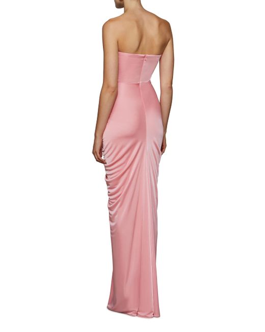 Crafted of glossy jersey, Et Ochs' Selena strapless gown showcases a notched neckline, front draped skirt, and timeless column silhouette. Notch neck Strapless Draped front Concealed back zip closure 100% polyester Dry clean Imported SIZE & FIT About 61.75" from topline to hem Model measurements: 5'10" tall Model is wearing a US size 4. Contemporary Sportswear - Trend > Et Ochs > Saks Fifth Avenue > Barneys. Et Ochs. Color: Pink. Size: 0.