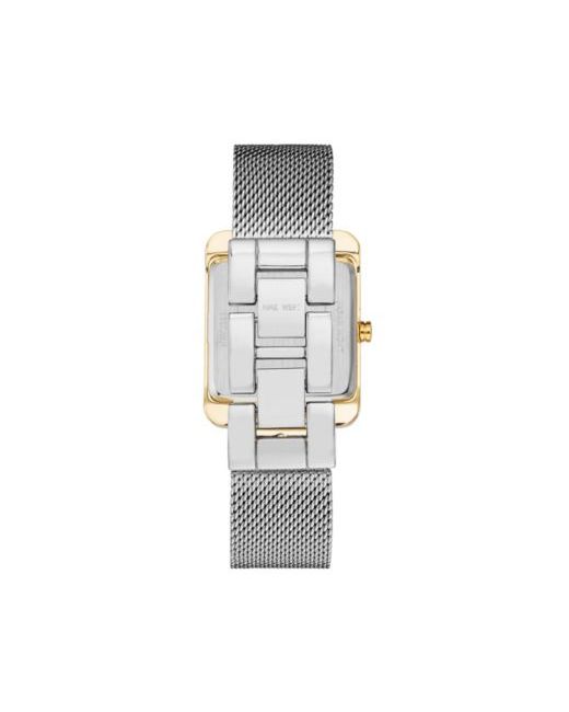 This silver-tone stainless steel mesh band watch from Nine West is a sophisticated statement piece. With architecture-inspired details, this minimalist watch features a gold-tone case and matching hands and markers. Style # Nw-2091SVTT.