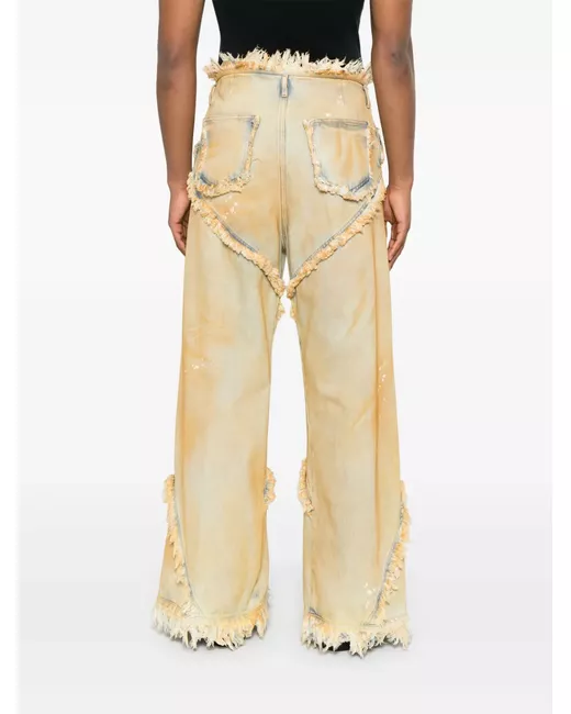ochre yellow front button and zip fastening belt loops classic five pockets frayed edge