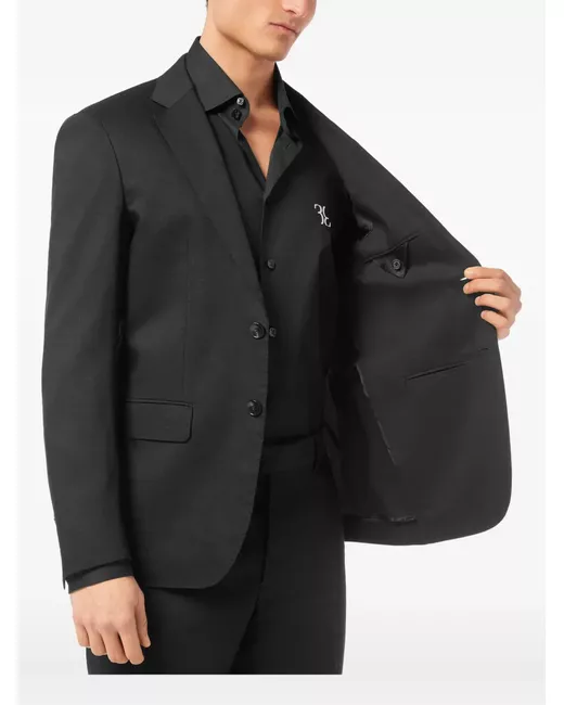 black front button fastening jetted chest pocket two front flap pockets English rear vents