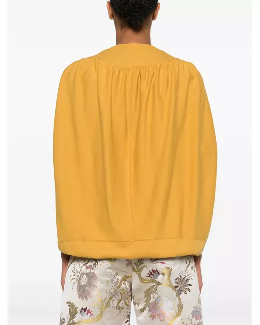 circa 2018 mustard yellow cotton puffball design crew neck empire line short draped sleeves ribbed-knit edge Condition: EXCELLENT. This previously owned item is in near-perfect condition with no signs of damage or use.