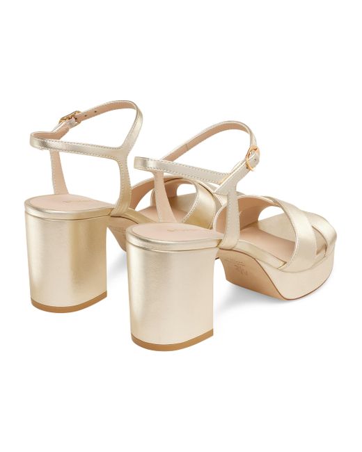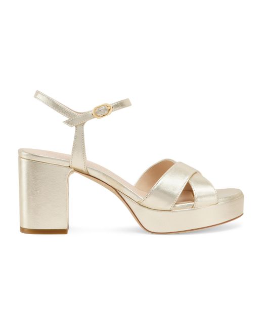 Crafted of leather, these Stuart Weitzman Dayna platform sandals feature a buckle closure and block heel. Open toe Buckle closure Leather upper Leather lining Leather/TPU sole Made in Spain SIZE Block heel: about 3" (75mm) Platform: about 0.75" (20mm) ABOUT THE BRAND Designer Stuart Weitzman started his career designing for his father's shoe company, before launching his own brand in 1986. Known for his glamorous pumps and over-the-knee boots, Weitzman has also incorporated unique materials in his designs, ranging from Lucite and wallpaper to cork, vinyl and even gold. Today, the label continues to create classic, feminine silhouettes that balance both comfort and style. Women's Shoes - Stuart Weitzman Wmn Shoe > Stuart Weitzman > Saks Fifth Avenue > Barneys. Stuart Weitzman. Color: Light Gold. Size: 10.