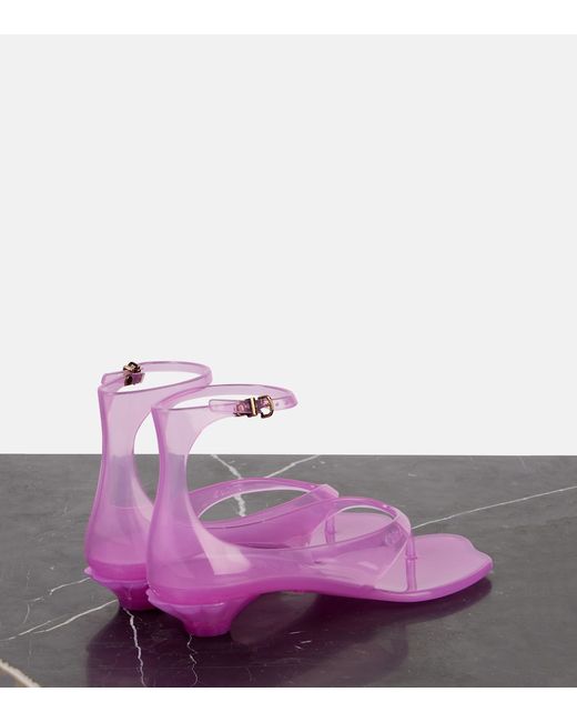 Upper: rubber. Lining: rubber. Sole: rubber insole and sole. Toe shape: square open toe. Made in Italy. Includes: shoe box, dust bags. Designer color name: Pink Fizz. Item color: pink. Closure: buckle-fastening ankle strap. Hardware color: gold.