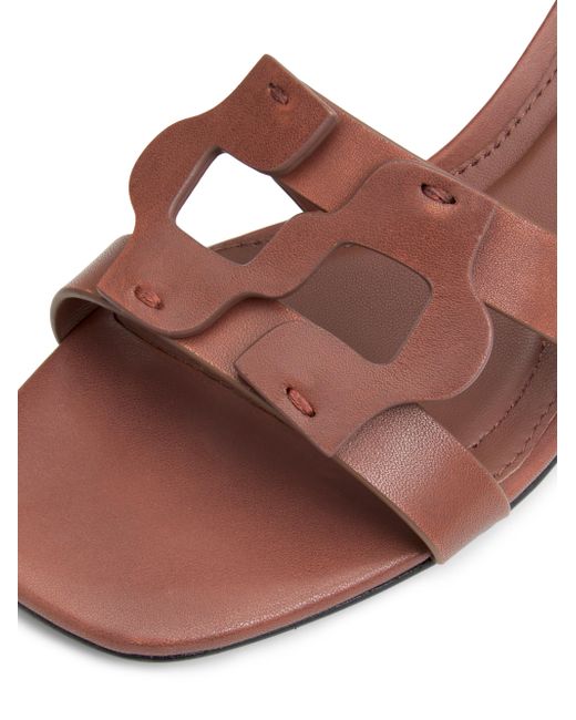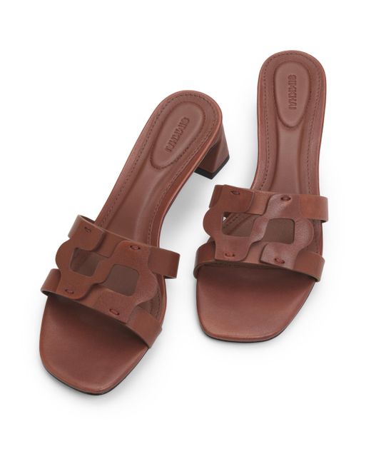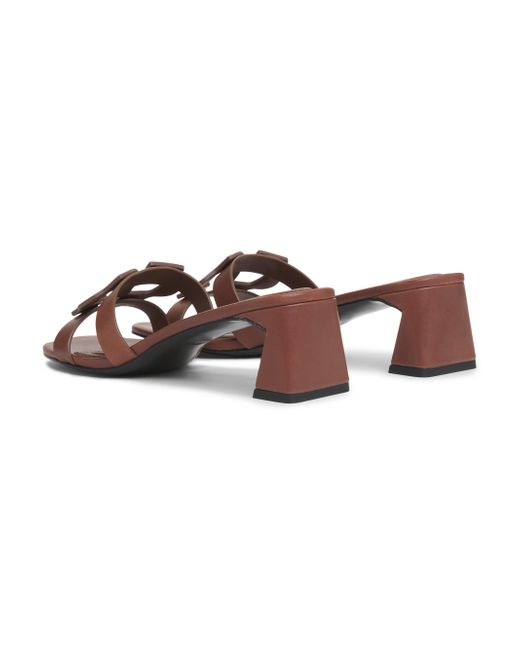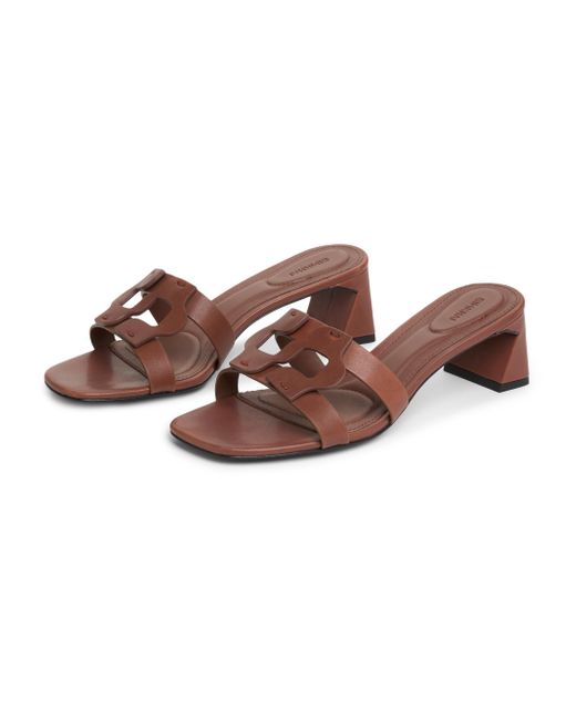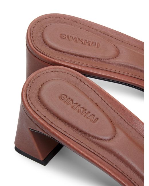 SIMKHAI's Monogram block-heel sandals feature a striking hardware vamp detail and an embossed logo at the padded insole. Open toe Slides on Leather upper Leather lining Leather sole Imported SIZE Heel: about 2"" (50mm). Women's Shoes - Workshop Shoes > Simkhai > Saks Fifth Avenue > Barneys. SIMKHAI. Color: Sable. Size: 8.