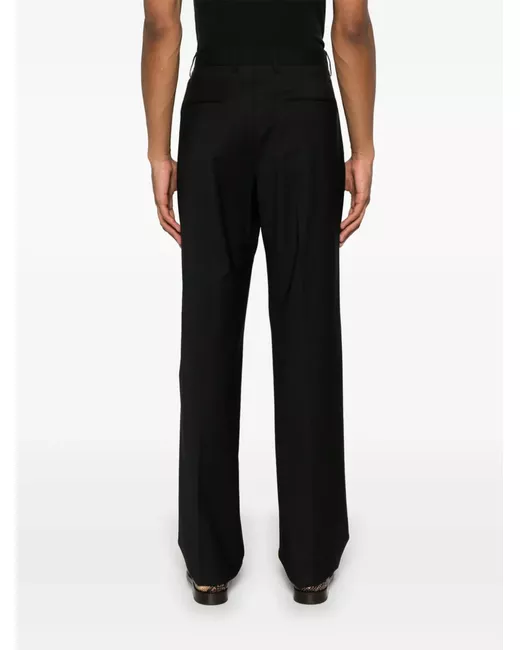 black concealed front button, hook and zip fastening belt loops two side inset pockets two rear jetted pockets