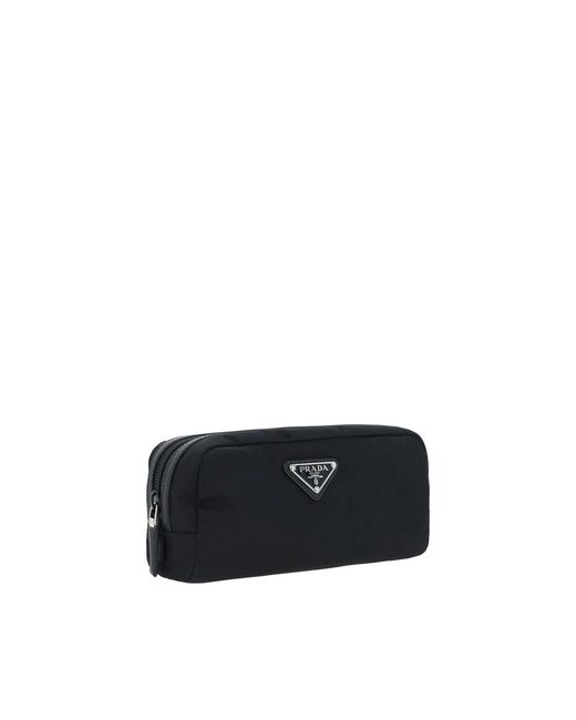 Re-Nylon Beauty Case by Prada, top zipper closure, triangular logo plaque applied to front, leather details.