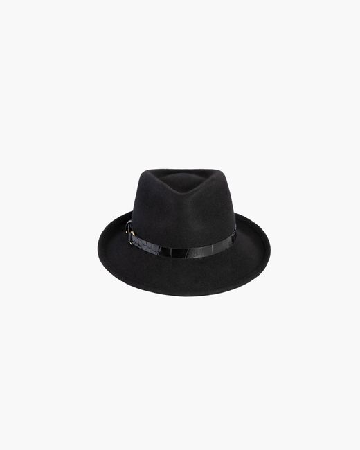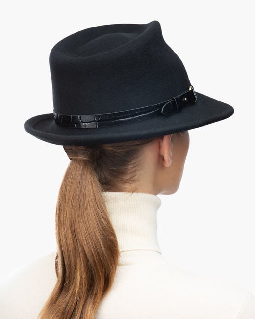 This water-repellent wool-felt fedora is perfect for those who don't want too many hats. The abbreviated brim looks snappy and is reminiscent of mannish hats from the 1950s. This wardrobe staple has an adjustable band of embossed calf leather with antique hardware. The Crown is lined. The elasticized inner band fits most. Imported. Brim Span: 2.5"