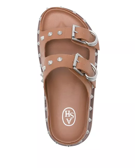 light brown double buckle fastening round open toe branded leather insole flat rubber sole