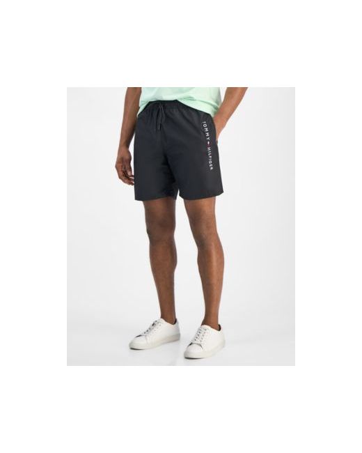 A sleek, sporty logo runs up the length of these drawstring swim trunks from Tommy Hilfiger, giving you a classic look that's ready to glide through the water with ease.