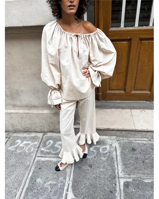 light beige front tie fastening elasticated trim tied cuffs off-shoulder