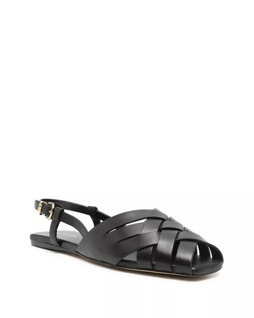 striking black design intricate woven detailing across the upper open toe for breathability adjustable slingback strap flat sole for comfortable wear
