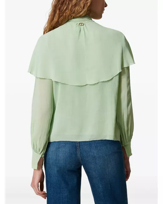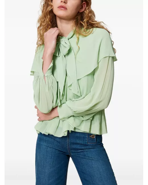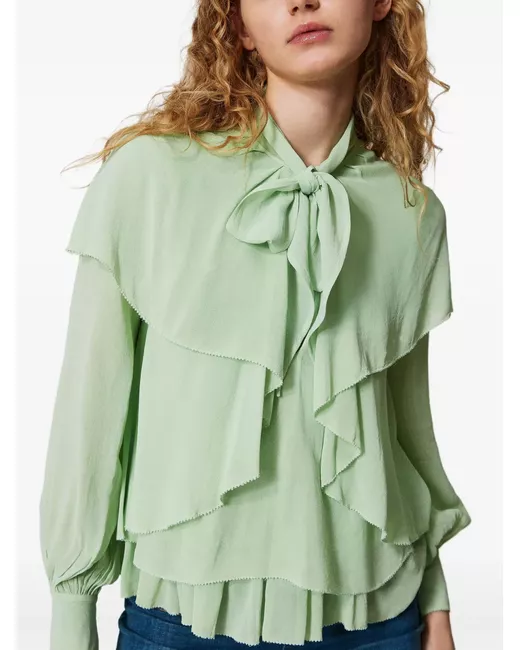 mint green halterneck tie fastening fully ruffled long sleeves layered design