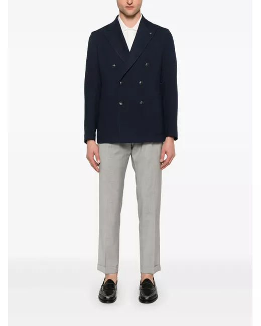 navy blue double-breasted button fastening chest welt pocket two front patch pockets English rear vents