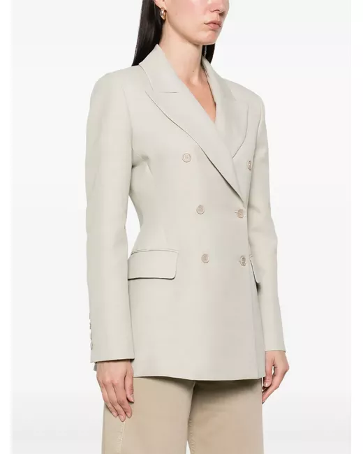 light grey double-breasted button fastening shoulder pads two side flap pockets American rear vent