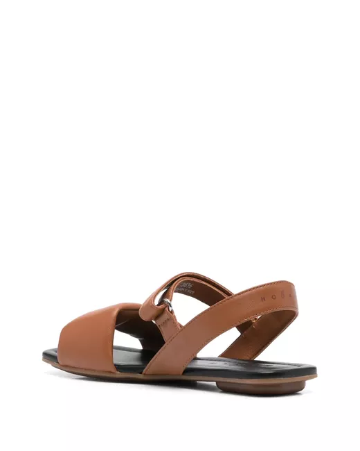 camel brown side touch-strap fastening branded leather insole flat rubber sole square open toe