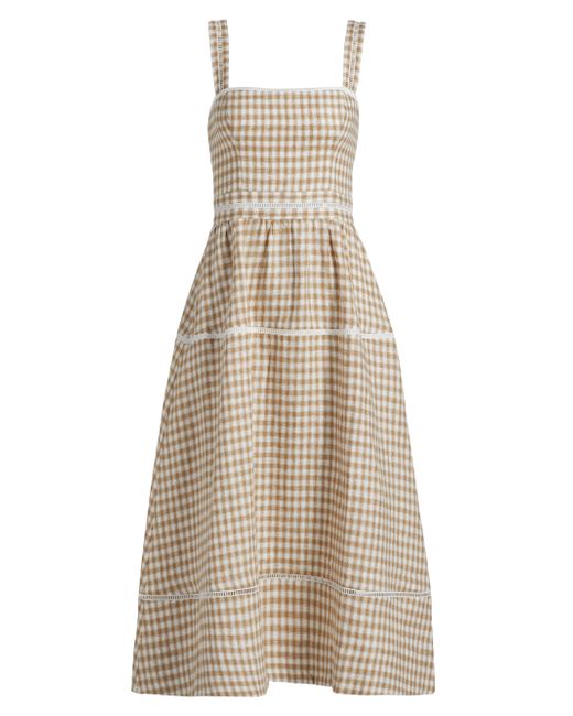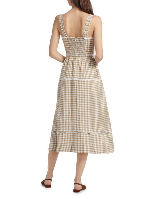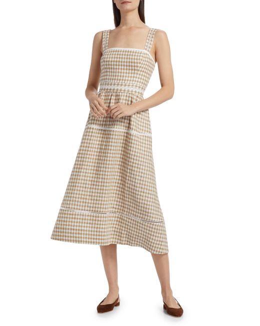 Crafted of breezy gingham-printed linen, Reformation's Everett midi-dress features ladder-embroidered trimming at the banded waist and A-line skirt. Tailored with convenient side on-seam pockets, this piece is elevated by princess seams and a smocked back panel. Squareneck Fixed straps Side on-seam pockets Smocked back panel Concealed back zip closure 100% linen Machine wash Imported SIZE & FIT About 42.25" from topline to hem Bust: about 26" Waist: about 24" Model measurements: 5'10" tall Model is wearing a US size 4 Please Note: Compared to the Brand's Size Guide, this style measures true to size. Contemporary Sportswear - Contemporary Collections > Reformation > Saks Fifth Avenue > Barneys. Reformation. Color: Dunes Check. Size: 0.