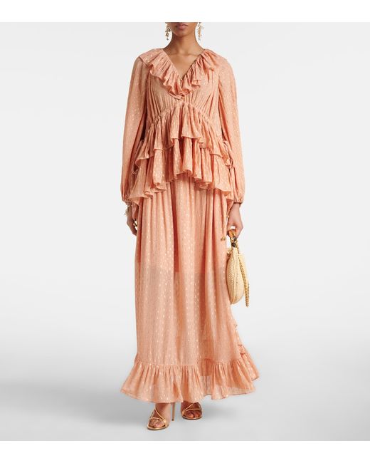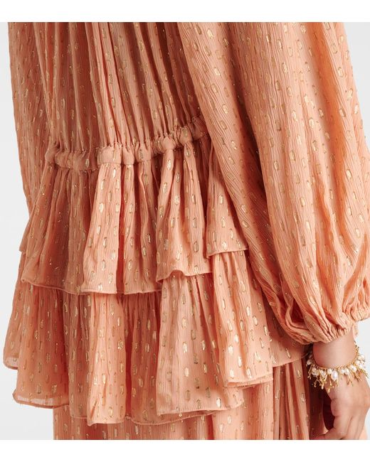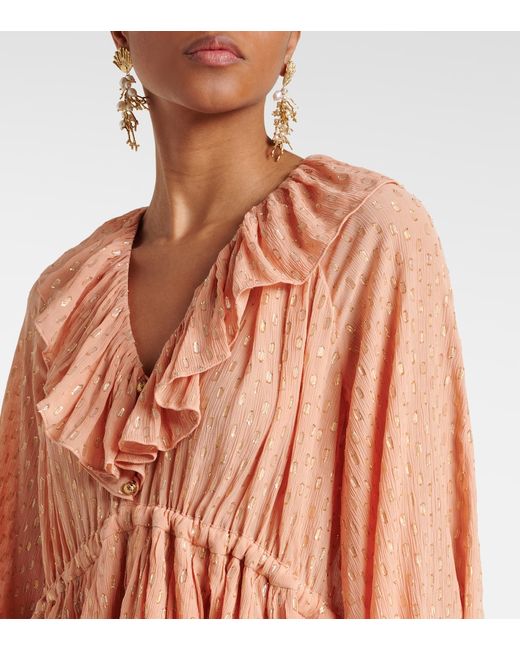 Material: 94.4% viscose, 5.6% metallic fibres. Care instructions: dry clean. Made in China. Designer color name: Peach. Item color: orange. Drawstring waist. Closure: partially buttoned front.