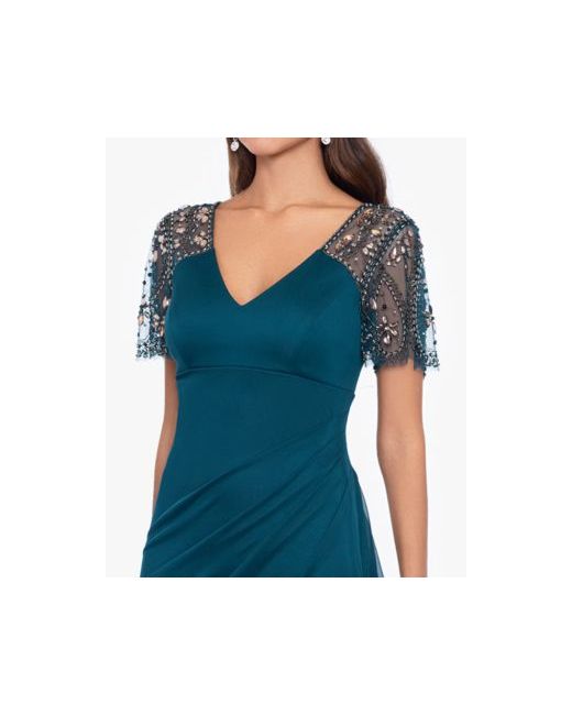 Shimmery sleeves and strategically draped chiffon combine to create this gorgeous evening gown by Xscape, the perfect style for a very special occasion.