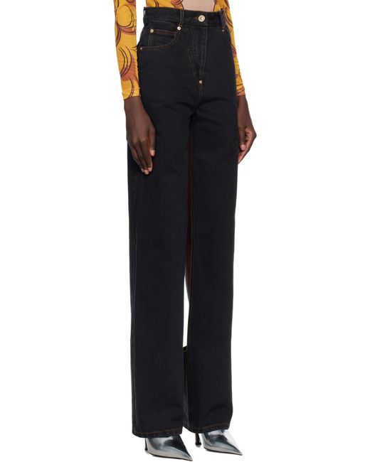Tapered non-stretch denim jeans. Subtle fading throughout. · High-rise · Belt loops · Five-pocket styling · Zip fly · Logo patch at back waistband · Cutout at back legs · Logo-engraved gold-tone hardware · Contrast stitching in tan Supplier color: Black