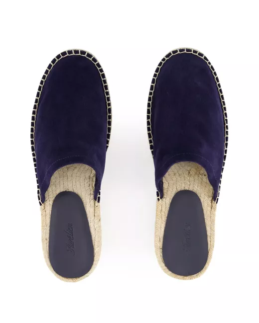 navy blue suede whipstitch detailing round toe slip-on style jute sole rubber outsole