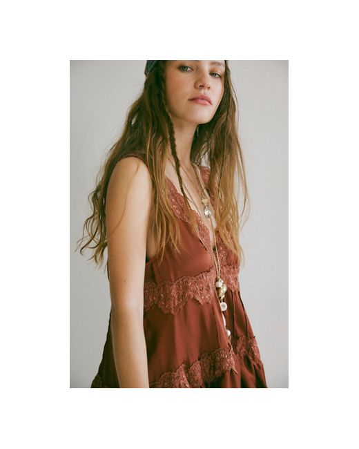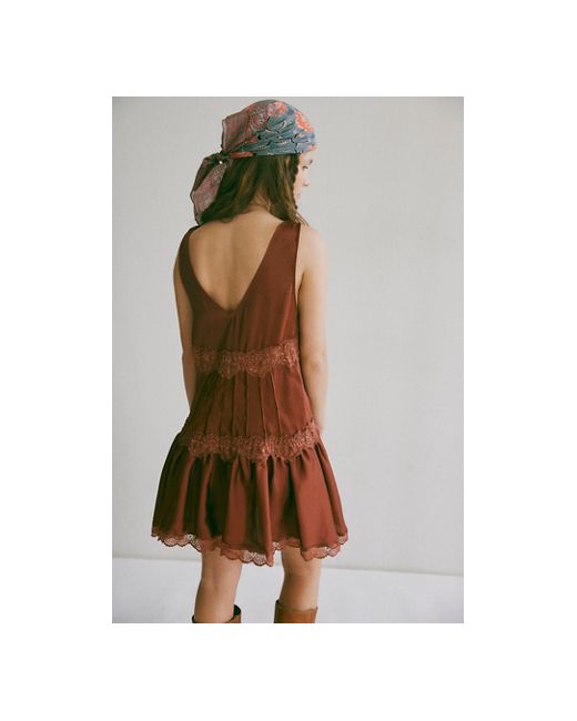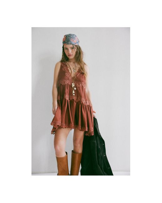 Romance awaits with this floaty mini slip from Intimately, featured in a silky, tiered design with lace trim for a truly delicate detail. **Fit:** Mini length, A-line **Features:** Silky fabrication, babydoll style, V-neckline, tiered design, lace trim **Why We In This Groove Mini Slip by Intimately at Free People in Toasted Cocoa, Size: XS
