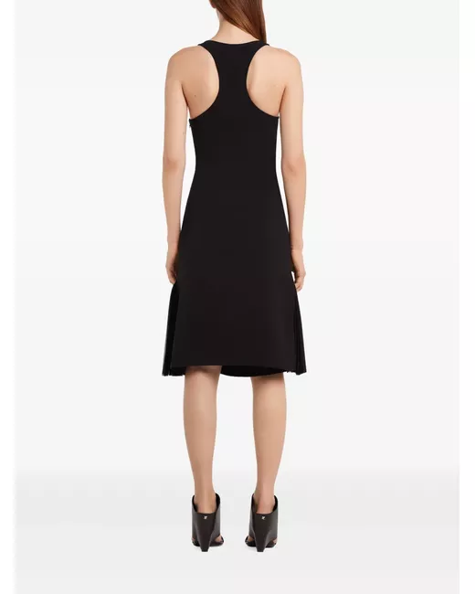 black embroidered logo to the front scoop neck asymmetric hem knee-length