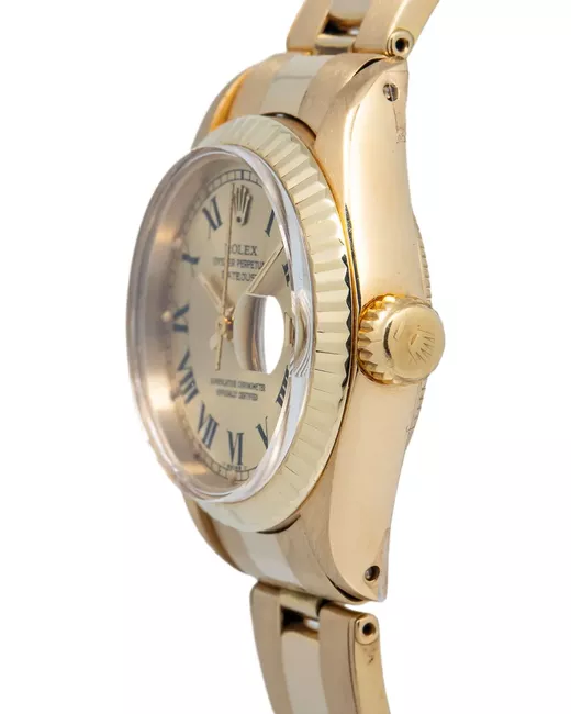 pre-owned 26mm gold-tone round face Roman numeral dial baton hands sweeping second hand 18kt yellow gold stainless steel case signature Oyster Perpetual bracelet self-winding movement fluted bezel screw-down crown engraved case back magnified date window folding clasp Normal everyday use and external agents may reduce the lustre of gemstones and gold surfaces. To maintain, use specific, non-abrasive products specially meant for cleaning jewellery. This item comes with a standard one-year warranty from the boutique. The original box and papers are not included.