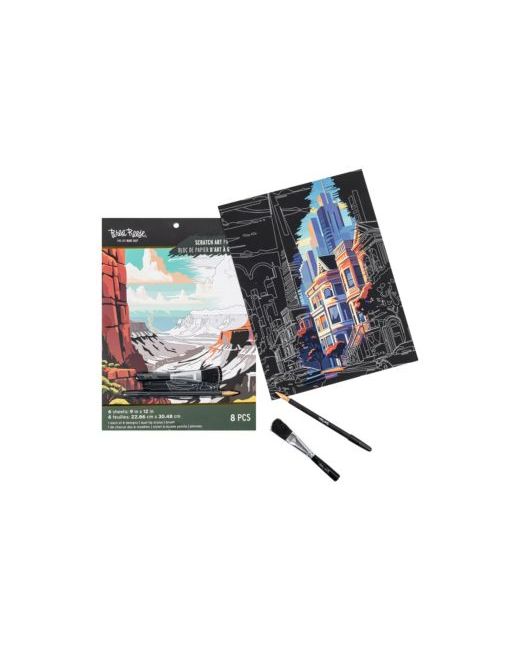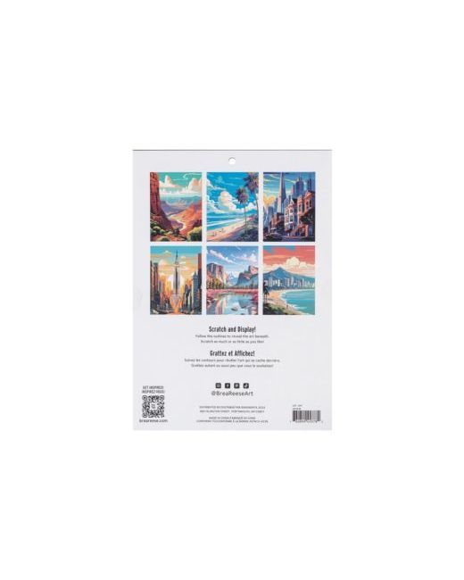 Scratch Art: Paper Pad - Destinations - Explore some of the world's most iconic landscapes with the Brea Reese Scratch Art Paper Pad - Destinations. Scratch and Display! Follow the outlines to reveal the art beneath. Scratch as much or as little as you like! This travel-inspired kit features six mesmerizing designs that capture the beauty of famous landmarks and vibrant cityscapes. From the majestic cliffs of the Grand Canyon to the palm-lined beaches of tropical coasts, and the bustling skyline of urban centers, each scratch reveals intricate details with pops of metallic color. The set includes a dual-tip stylus and brush for precise crafting, ensuring your artwork stands out beautifully. Whether you're a seasoned artist or new to scratch art, this kit provides a fun, meditative way to celebrate global destinations from the comfort of home. Craft kit Includes 6 Design Sheets (9" x 12"), 1 Brush, and 1 Dual-Tip Stylus.