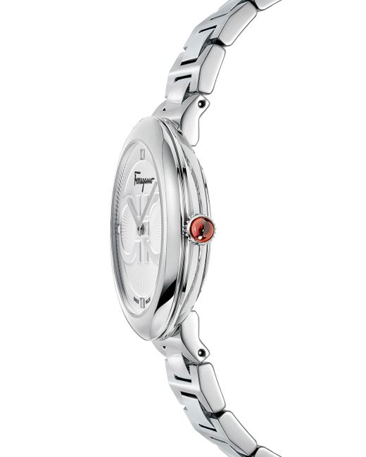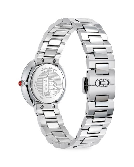 Per its name, Ferragamo chic is a timepiece collection that embodies the essential and elegant soul of the Ferragamo brand. The 32mm case encloses an elegant guilloché dial, embellished with a double gancini symbol in the center. A further touch of elegance is given by the four metal stud indexes, in line with the latest trends from the Maison. Swiss made quartz Sunray bezel Two hands Four metal stud indexes Water resistant to 3 ATM Stainless steel bracelet Deployant buckle Made in Switzerland SIZE Stainless steel bracelet, 16mm (0.75") Stainless steel round case, 32mm (1.25") ABOUT THE BRAND Italian designer Salvatore Ferragamo began his journey in 1927 with a vision of creating the world's most beautiful shoes. The label expanded to menswear in the 1970s, and remains famed for its made-in-Italy pieces. The craftsmanship inherent in its shoes is also found in accessories like sunglasses, belts and ties. The brand's signature Gancini logo-a backwards horseshoe-can be found on its classic loafers and fine leather goods. Men Accessories - Watches > Ferragamo > Saks Fifth Avenue > Barneys. FERRAGAMO. Color: Silver.