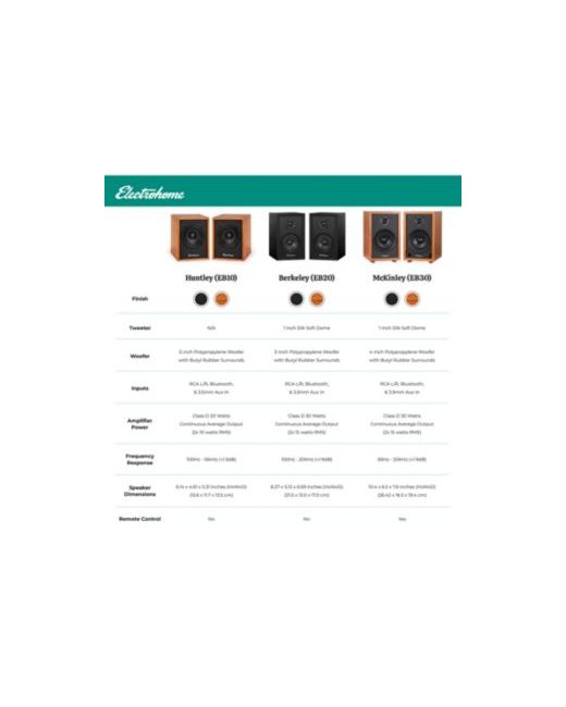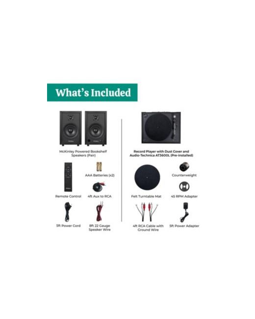 Continuing Electrohome's century-long tradition of developing HiFi audio products, the Montrose Record Player and McKinley Powered Bookshelf Speakers are skillfully engineered to provide you with an accurate representation of the original recording in an immersive concert-like vinyl listening experience that will make you fall in love with your favorite music all over again.What's Included: Montrose Wireless Record Player with Dust Cover, Audio Technica AT3600L Cartridge (Pre-installed), Felt Turntable Mat, Counterweight, 45 Rpm Adapter, 5ft 100V - 240V (50/60Hz) Ac Power Adapter, 4ft Rca Cable with Ground Wire, EB30 Powered Bookshelf Speakers (pair), Remote Control, 2x Aaa Batteries, 6ft Power Cord, 8ft 22 Gauge Speaker Wire, 4ft Aux to Rca Cable, User Manual, Lifetime Customer Support, 1 Year Manufacturer's Warranty