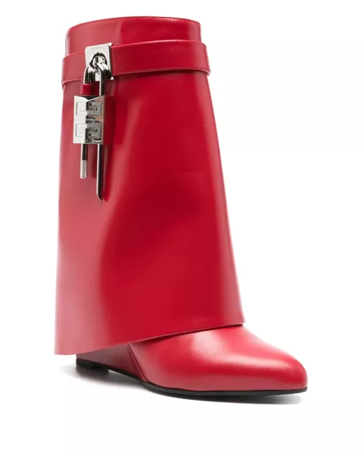 rose red concealed side zip fastening high wedge heel folded edge This piece comes complete with a protective dust bag.