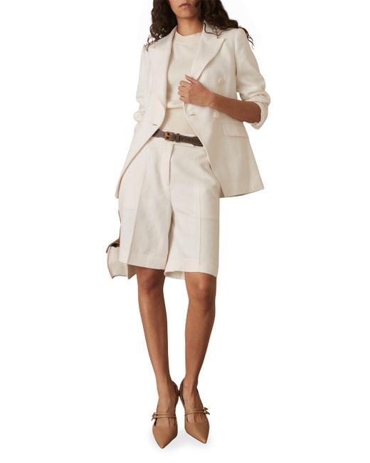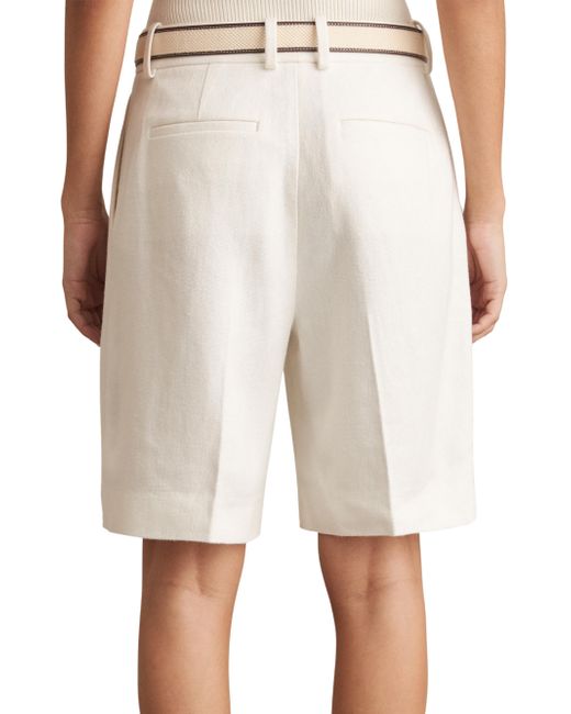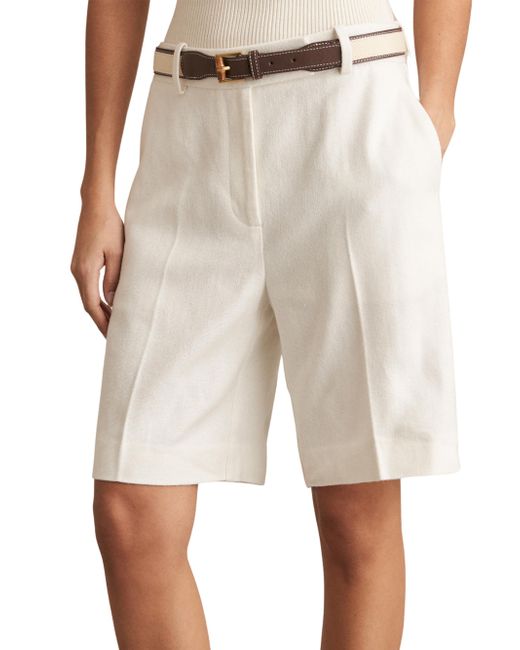 The Devon Bermuda shorts from Reiss are crafted of a linen blend and tailored in a crease-front design. A faux leather and braided raffia belt lends an elevated finish to this longline style. Belted Side seam pockets Back welt pockets Zip fly, hook-and-eye closure 55% viscose/ 45% linen Dry clean Imported SIZE & FIT Model measurements: 5'10" tall Model is wearing a US size 4. Modern Collections - Modern Trend > Reiss > Saks Fifth Avenue > Barneys. Reiss. Color: White. Size: 0.