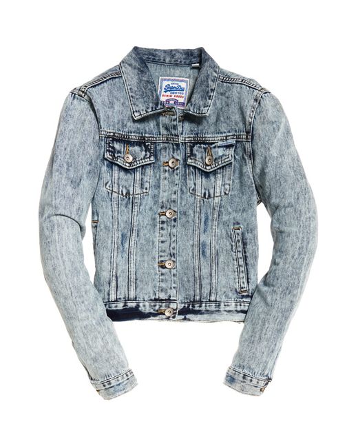 Superdry women's denim girlfriend jacket. This girlfriend fit denim jacket features a front button fastening, four front pockets and button cuffs. The jacket also benefits from side adjuster straps for a more fitted look and is finished with a subtle, metal Superdry logo badge on one of the pockets.