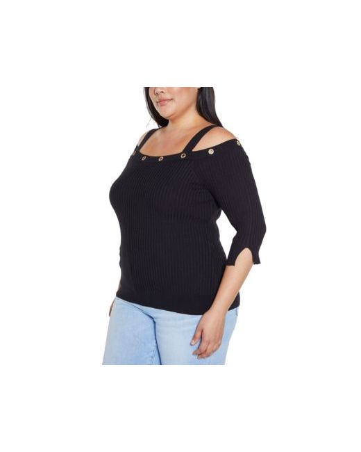 Women's Black Plus Label Rhinestone Grommet Cold-Shoulder Sweater