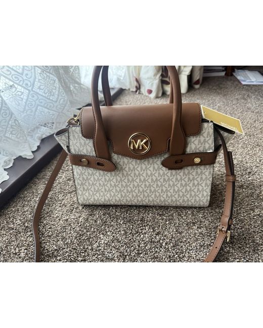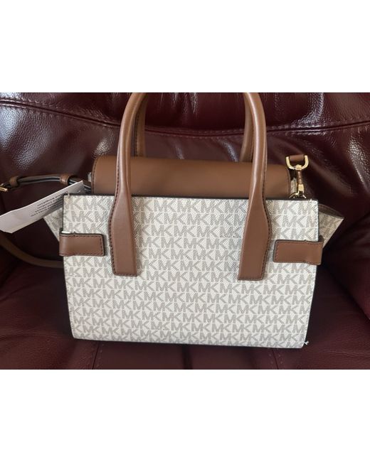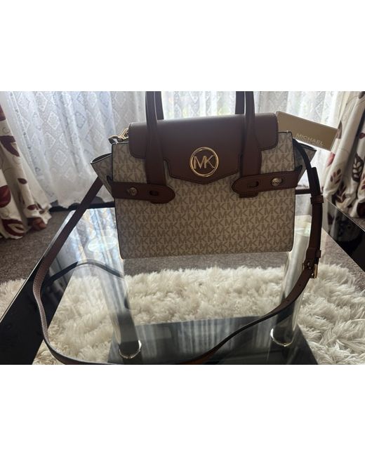 Elevate your accessory game with this stylish Michael Kors Logo Canvas Tote Bag. Perfectly designed for women who love to keep their essentials with them, this tote is crafted with a blend of canvas and leather exterior, making it durable and stylish. The brown exterior colour complements the cream hardware colour, giving it a chic look. The Michael Kors logo pattern on the bag adds to its elegance. The brown handle/strap material provides comfort while carrying the bag. This tote is perfect for any occasion, be it a casual day out or a formal meeting. Add this timeless piece to your collection today!