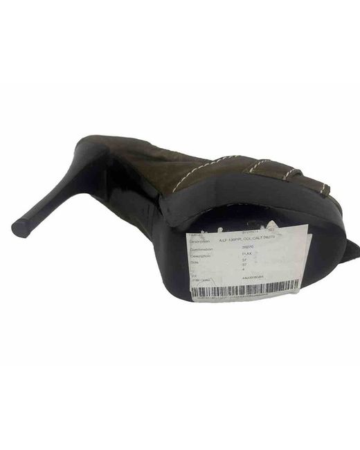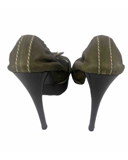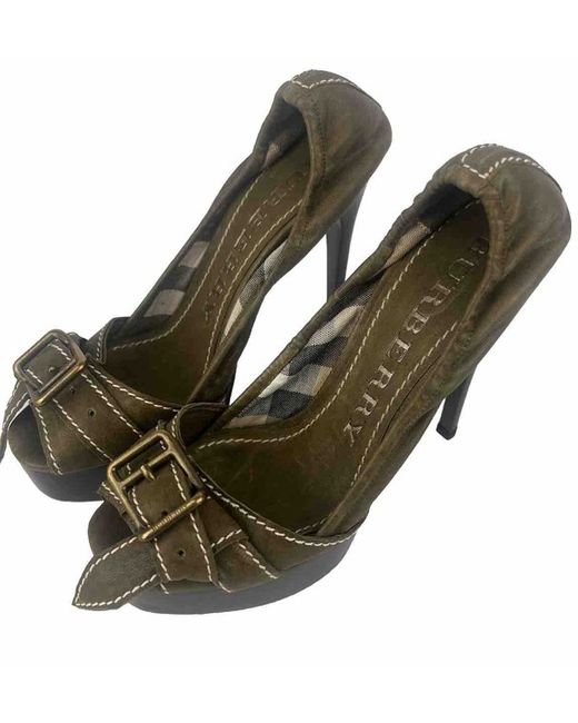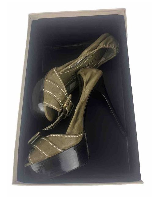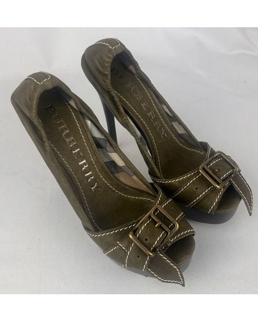 Elevate your shoe collection with these stunning Burberry Khaki Open Toe Stiletto Shoes. These shoes come in a size 4 and boast a stylish platform and buckle feature. The open-toe design and slip-on closure add to the chic and sophisticated look. The leather upper material and high stiletto heel create a sense of elegance and class. Perfect for any occasion, these shoes are a must-have for any fashion-forward woman. Add a touch of glamour to your outfit with these gorgeous shoes. Scratch on heel of right foot shown in photo