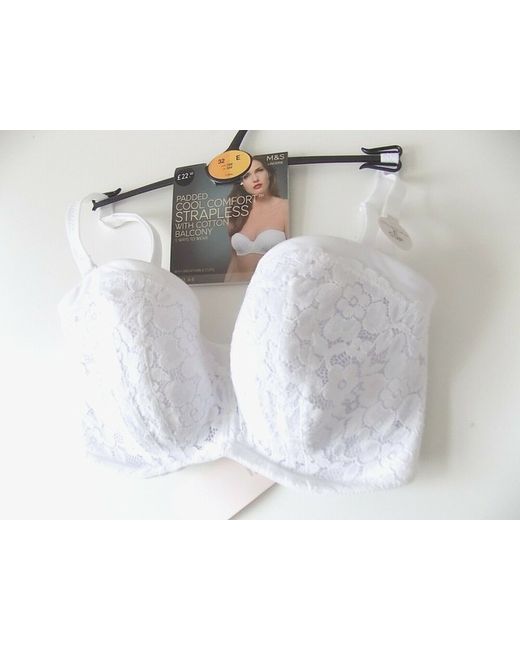 This is a beautiful designed strapless bra by M&S. The back is plain in an off white colour with 3 hook fastening. Colour White. 43% COTTON. It has soft side bones.