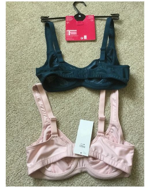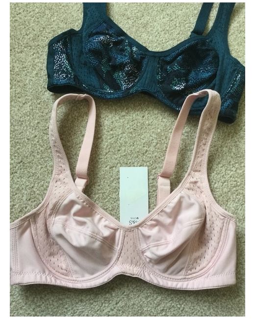 Ideal for aerobics and racket sports. Reduces bounce. One bra is teal blue patterned and the other is pale pink. Breathable so heat can move through the fabric regulating your temperature.
