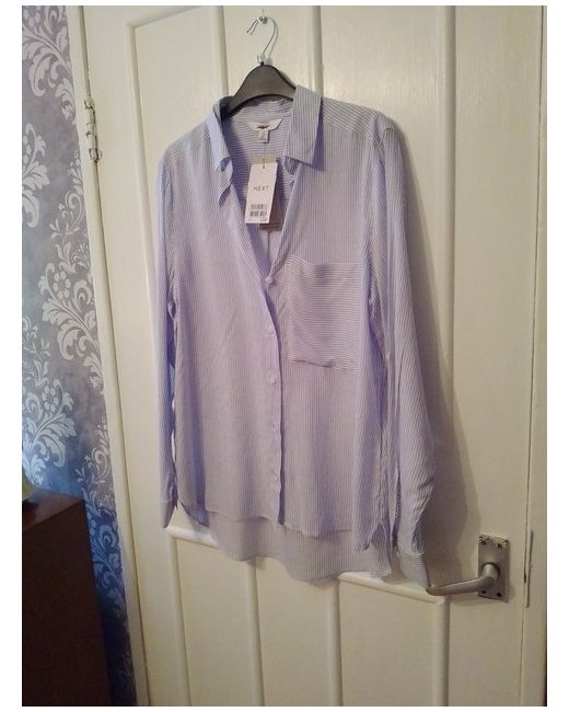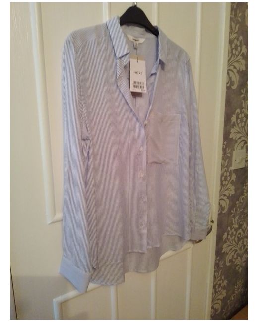 Elevate your wardrobe with this classic blue and white striped blouse from NEXT. Crafted from lightweight viscose fabric, this blouse features long sleeves, a collared neckline, and button accents. The versatile piece is perfect for all seasons and features pockets for added convenience. Ideal for a day at work or a casual outing, this blouse has a regular fit and is available in size 12. The striped pattern adds a touch of elegance to the basic style, making it a must-have for any fashion-conscious woman. Add this timeless piece to your collection today.