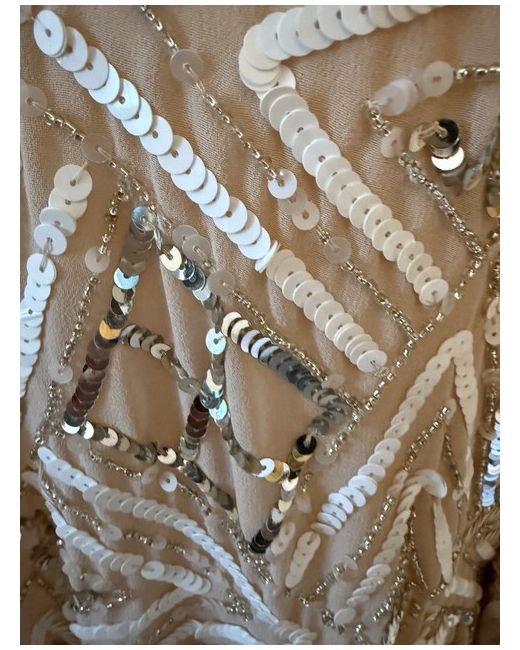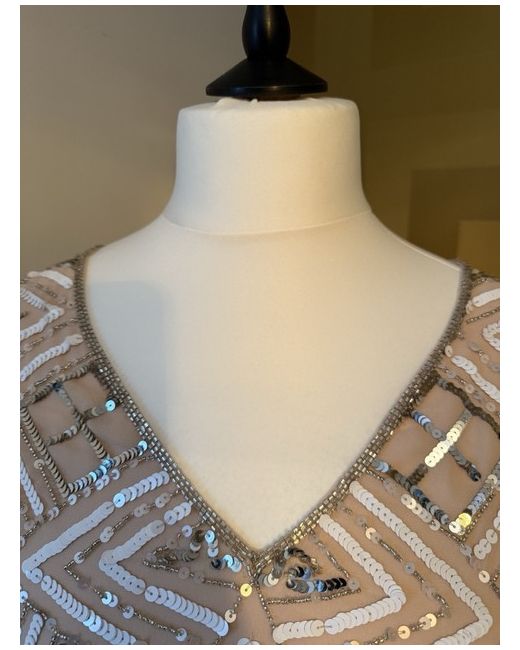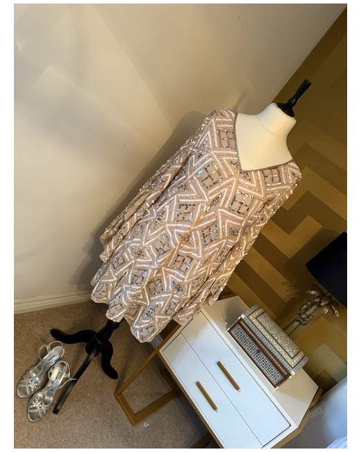 Make a statement in this stunning River Island Sequin dress, perfect for any formal occasion. The lined A-line style and knee-length cut create a flattering silhouette, while the 3/4 sleeves add a touch of elegance. The dress features a beautiful beige colour and is made from high-quality chiffon fabric that flows effortlessly. This dress is perfect for weddings, parties, or any formal event. It is available in a size 16 and is designed for regular size types. The dress comes with tags and is a must-have for any fashion-forward woman.