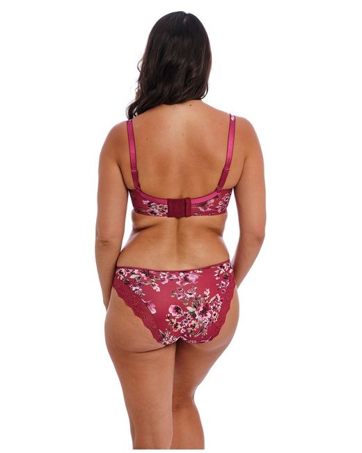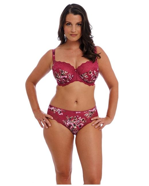 Non padded, underwired cup. Three section cup with side support for great uplift and forward shaping. Wide wired for comfort. Pretty print on red background. Pretty lace to top section of cup.