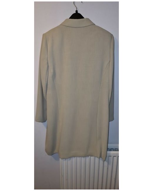 This Dorothy Perkins smart jacket is a longline blazer made of beige polyester fabric, featuring a pointed collar and button closure. It is a size 16, suitable for various occasions including travel, parties, workwear, and formal events. The jacket is lightweight, lined, and has long sleeves with button accents, making it a versatile piece for all seasons. With its classic fit and single-breasted design, this limited edition jacket adds a touch of sophistication to any outfit.
